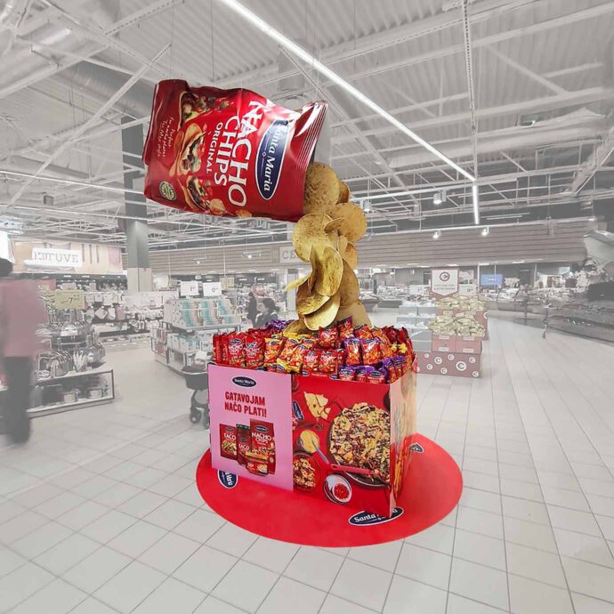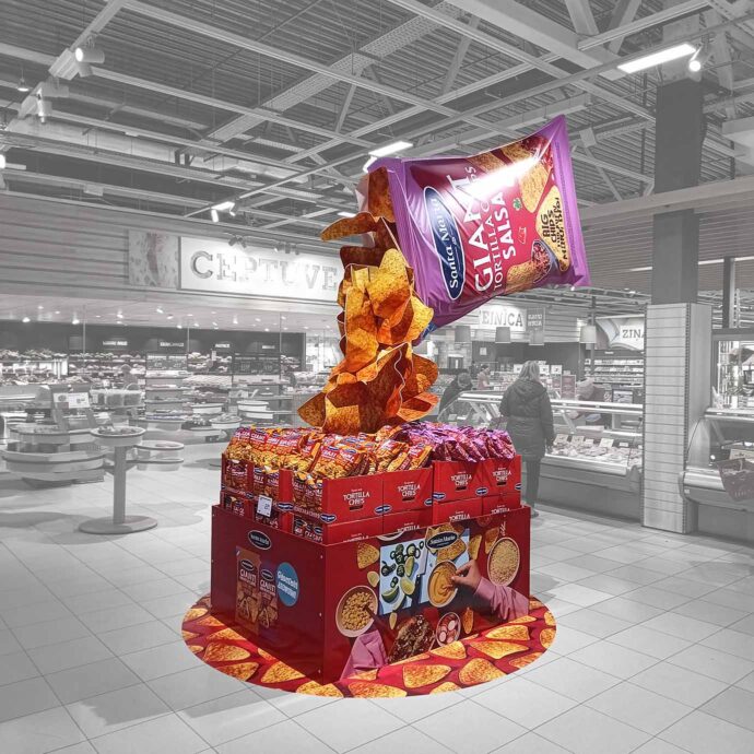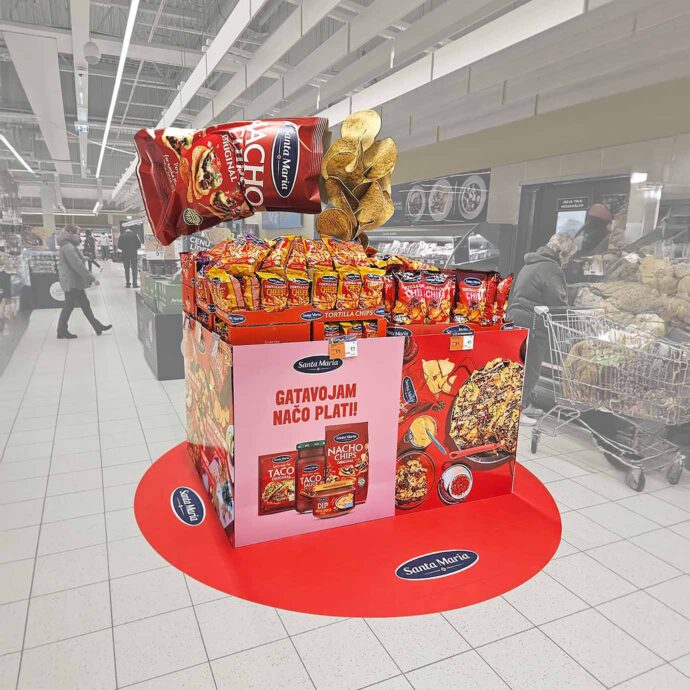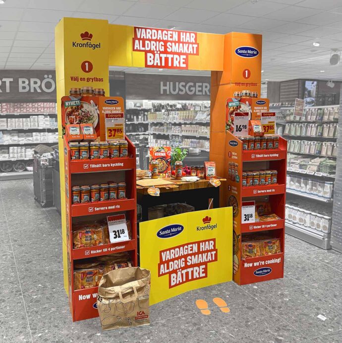 Vi ser butiksmaterial som ett smörgåsbord där man själv väljer ut de delar man vill ha med i en kampanj. Det kan tex vara portaler, pallsvep, golvdekaler, takskyltar och popups.