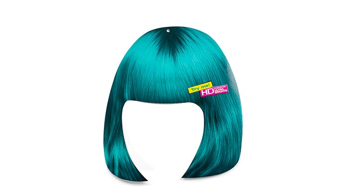 Ett kul exempel är figurstansade ”peruker” som hängdes vid hyllan, ihop med en spegel. Tanken var att kunden skulle testa att se sig i spegeln med en av dessa ganska häftiga hårfärgerna, som var produkten som marknadsfördes. Gissa om alla på kontoret har testat dessa…?