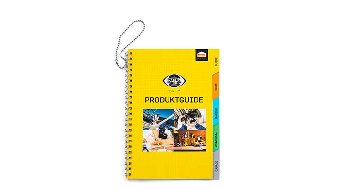 En annan lösning är en produktguide med tumgrepp (”registerstansning”) för respektive produktgrupp. Guiden binds med wire-o för enkel bläddring och hela guiden hängs vid hyllan med en kedja.